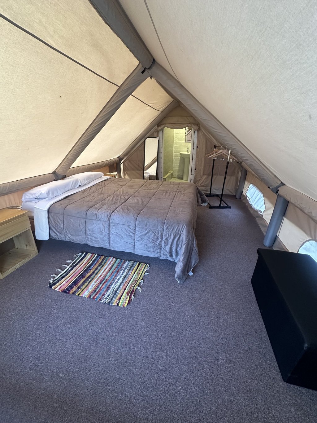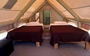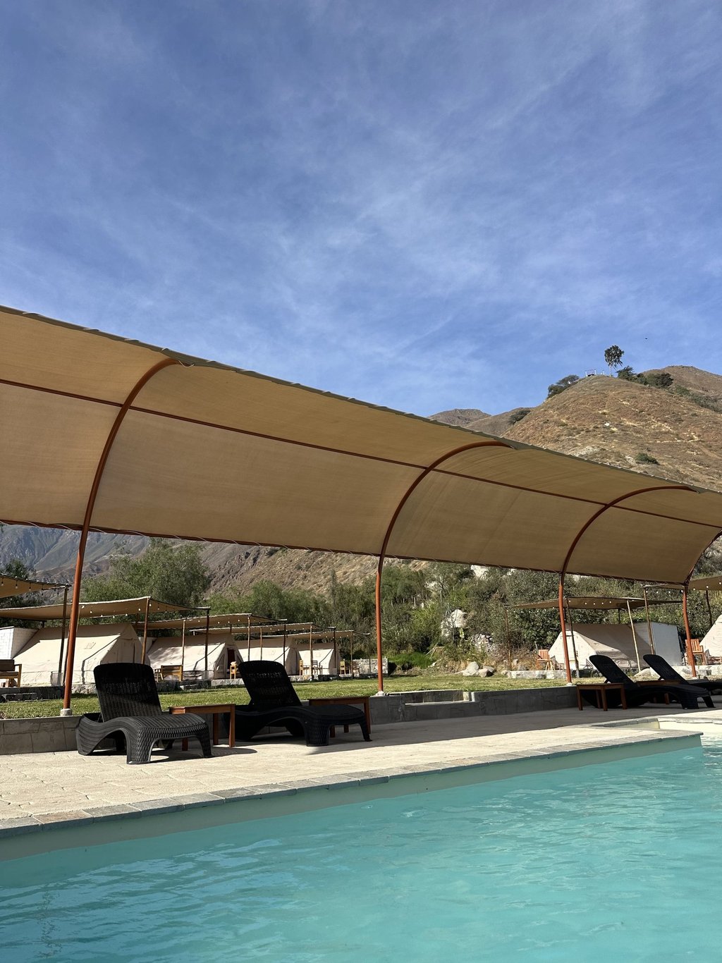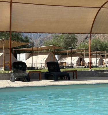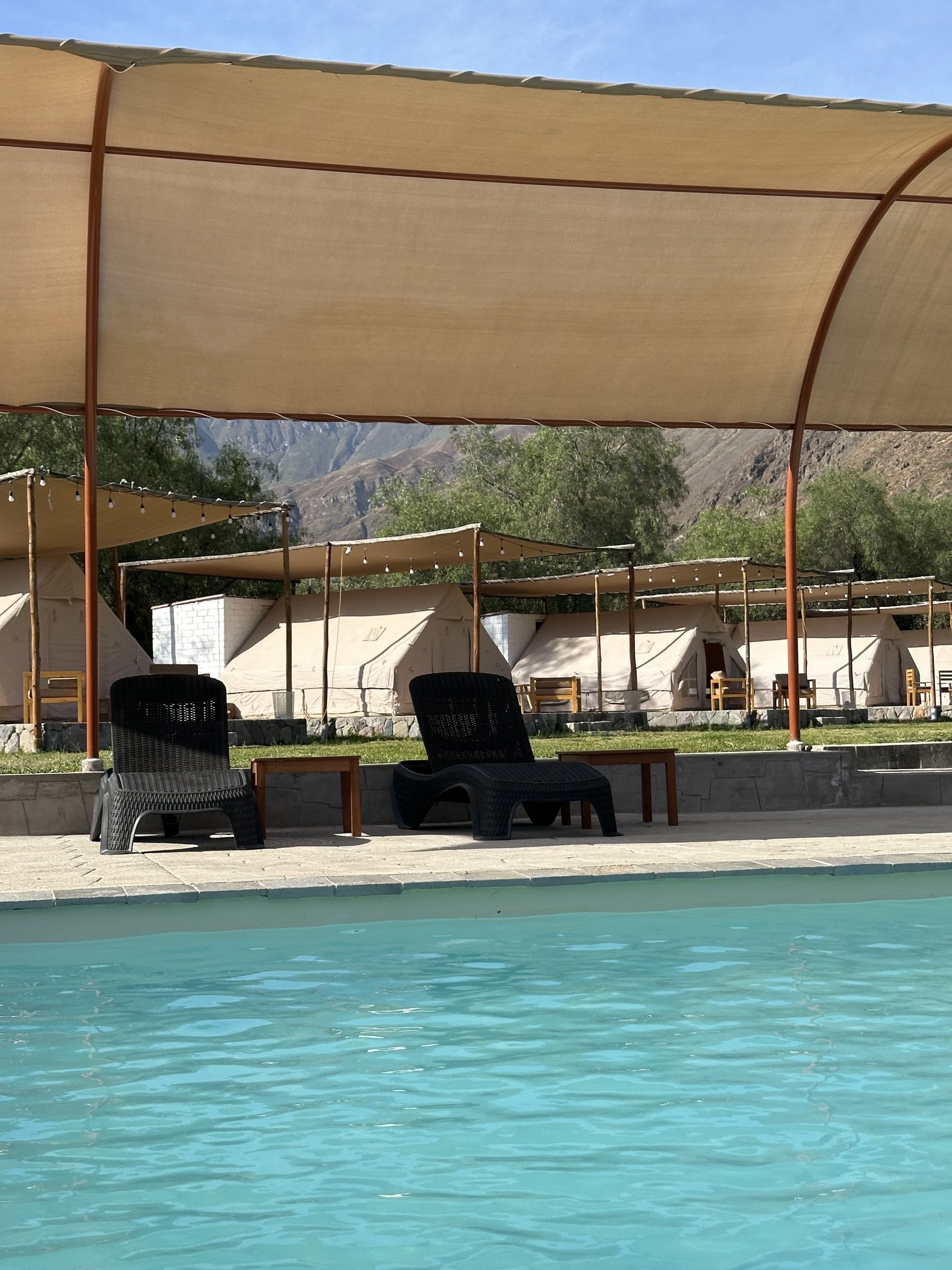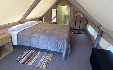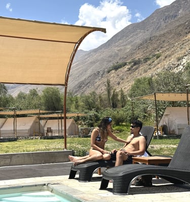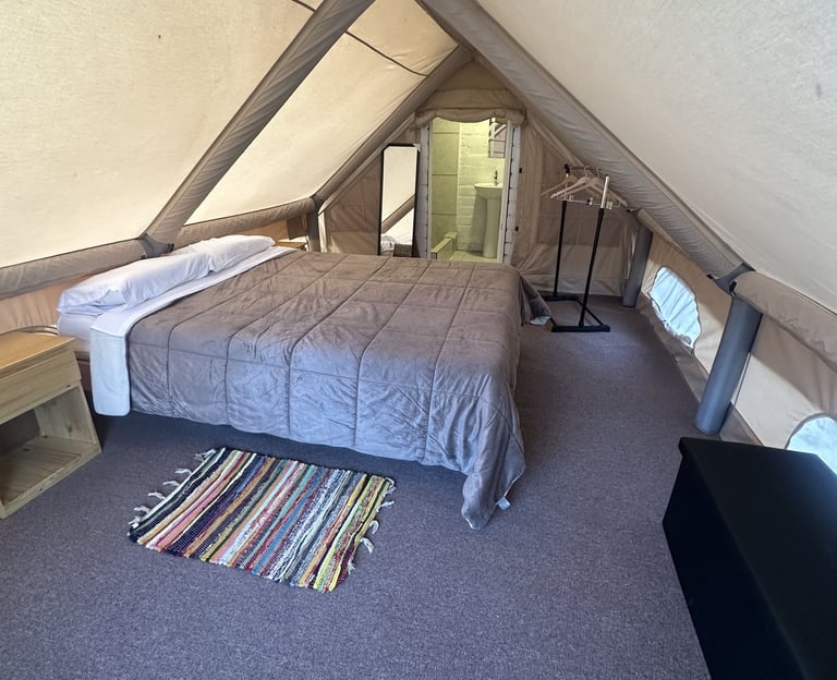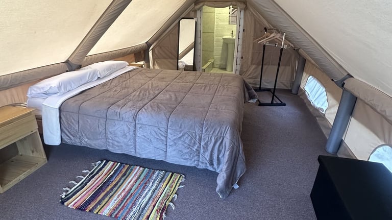 Carpa para 2 personas, con acceso rápido a la piscina y baño privado con agua caliente.